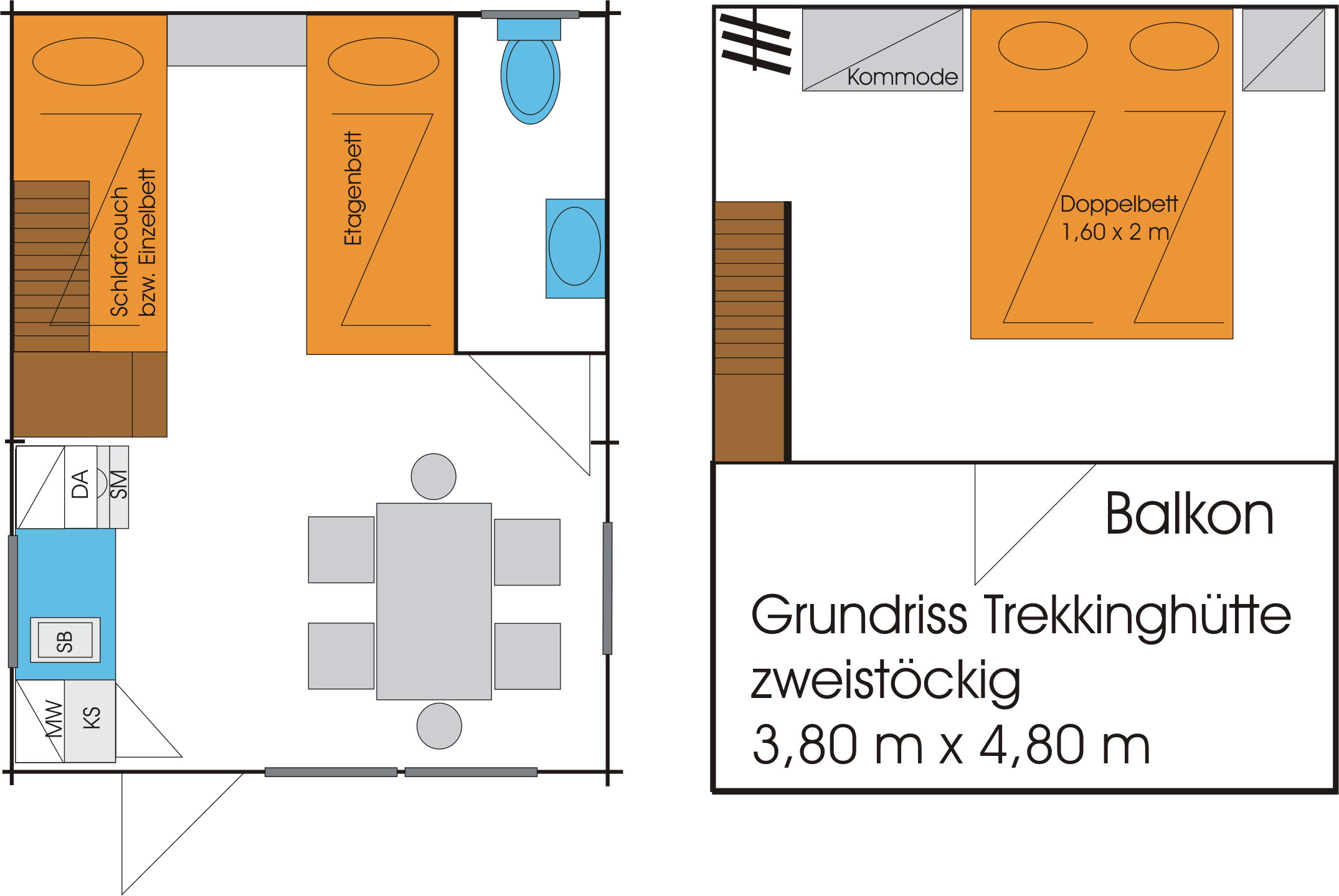 Die neuen zweistöckigen Trekkinghütten bieten Platz für bis zu 5 Personen und sind in der unteren Etage eingerichtet mit einer komplett ausgestatteten Küche inkl. Warmwasser, Spülmaschine, Kühlschrank, Mikrowelle, Wasserkocher und Geschirr, Kleiderschrank, Toilettenraum, Esstisch und einem Etagenbett (2x 90x200 cm) sowie entweder einen Einzelbett (90x200 cm) oder einem umbaubaren Schlaf-Sofa. Die obere Etage ist nur über eine schmale Treppe erreichbar. Dort befindet sich ein Doppelbett (160x200 cm) sowie der überdachte Balkon mit Gartenmöbeln und Seeblick.